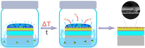 A simple method to functionalize the support was reported by Jeong et al., in 2013. This method is based on soaking the support initially in the first component solution (like metal precursor in this case) for few hours, then subjecting it to solvothermal growth conditions in the solution containing the ligand (Figure 10) [69]. Upon support contact with the component solution, either metal ions or ligand molecules, as a result of concentration, can diffuse to the solution from the support or vice versa. The metal ions and ligand solutions were retained in high concentrations in the area of the support throughout the solvothermal handling. The MOF thin film growth was completed after nearly 30 min of reaction and its thickness was about 1.5 μm, which did not vary after longer growth times.