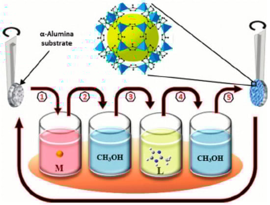 The layer-by-layer (LBL) growth method, developed by Shekhah et al. in 2007, was successfully applied for fabricating thin films of HKUST-1 MOF [47,50,51,101,102,103]. The LBL growth method for growing MOFs is based on exposing of the support surface to the reaction precursors in an alternating approach involving rinsing the excess/unreacted precursors after each their exposure to the surface. Using this approach makes it possible to grow different types of surface-mounted MOFs (SURMOFs) on organic and oxide surfaces.