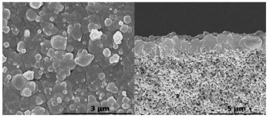 Representative examples of SEM micrographs of the top view (left) and cross-section (right) of the ZIF-8 membrane grown using 300 cycles of the LPE method on an alumina substrate (adapted with permission from ref. [52]).