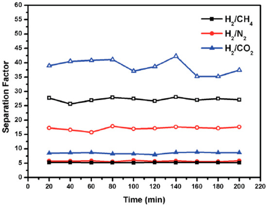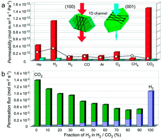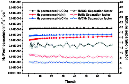 In 2010, another ZIF membrane, ZIF-7, was reported by Caro et al. This membrane was grown using a microwave-assisted secondary growth approach; it has the same sodalite topology, like ZIF-8, but a small pore aperture [123]. ZIF-7 is a hydrophobic MOF with high thermal stability and a pore dimension that is smaller than ZIF-8 and almost similar to the size of H2, which is expected to achieve a higher H2 selectivity via molecular sieving. The single and mixed-gas permeation results for the fabricated ZIF-7 membrane were tested at 200 °C and 1 bar using the Wicke–Kallenbach technique and they are shown in Figure 22. The selectivities of the binary mixtures examined in this study for H2/N2, H2/CO2, and H2/CH4, were higher than Knudsen and found to be 7.7, 6.5, and 5.9, respectively.