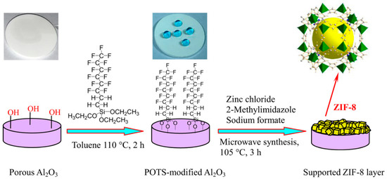 Scheme of the preparation of ZIF-8 membranes on hydrophobic α-Al2O3 supports through 1H,1H,2H,2H-perfluoroalkyltriethoxysilanes (POTS) modification (adapted with permission from ref. [121]).