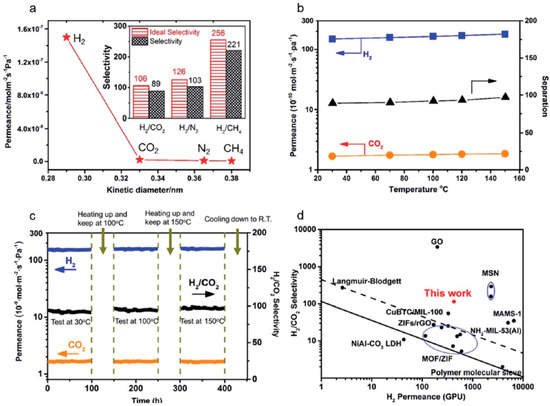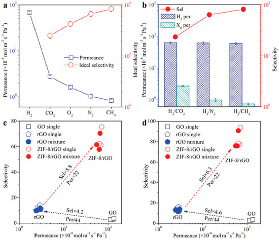 (a) The permeation properties of various gases through the ZIF-8/rGO membrane. (b) The separation performance of the ZIF-8/rGO membrane for H2/CO2, H2/N2, and H2/CH4 mixtures. The comparison of the GO, rGO, and ZIF-8/rGO membranes for (c) H2/N2 and (d) H2/CH4 separations. (adapted with permission from ref. [122]).