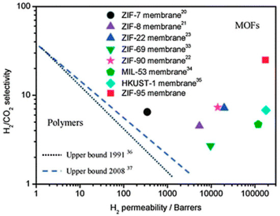 Nowadays, hydrogen (H2) is one of the trustworthy, viable, and environmental friendly energy sources, which could fulfill the world’s increasing energy requirements through its application as a highly dense energy source [108]. However, it co-occurs with other light gases such as N2, CH4, CO2, etc., in the course of production in many industrial processes. Consequently, there is a necessity for the development/improvement of advanced separation techniques to separate it from the above-mentioned impurities and get it as pure H2, which is the highly valuable fuel product. Provided optimal membranes are available, membranes-based separation offer a promising energy-efficient alternative to surpass the commercially applied highly energy intensive cryogenic separation [109]. Among other materials, zeolite-based membranes that are characteristic of its well-defined pore structures were fabricated by various techniques and investigated for H2 refining from exhausted gas streams [110,111]. Recently, MOF-based membranes were explored for this important gas separation; specifically, H2 recovery [112]. Here, we highlight some of the reported MOF membranes properties that are used for H2 purification and recycling.