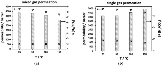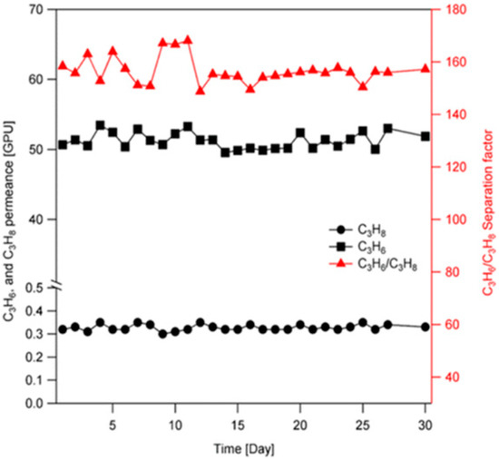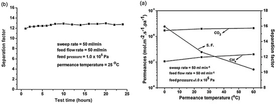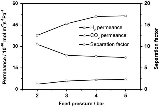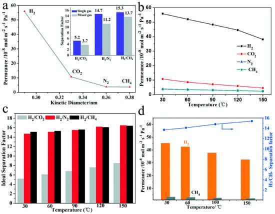 In a recent study, Caro et al. established a simple synthesis strategy for ZIF-8 membranes fabrication that was built on improving the support hydrophobicity by functionalization with a highly hydrophobic polymer, namely 1H,1H,2H,2H-perfluoroalkyltriethoxysilanes (POTS) (Figure 20) [121]. A high quality 20 µm thick ZIF-8 membrane was grown on the POTS-modified α-Al2O3 support, which exhibited a higher H2 selectivity and thermal stability. The mixture separation factors of different gases, like H2/CO2, H2/N2, H2/CH4, and H2/C3H8 were measured and were found to be 15.8, 22.6, 40.6, and 549.3, respectively, at 200 °C and feed pressure of 1 bar. The effect of temperature on the H2 permeance was investigated and showed that an increase in the temperature from 25° to 200 °C under same feed pressure of 1 bar, led to an increase in the H2 permeance accordingly from 1.4 × 10−7 to 2.3 × 10−7 mol·m−2·s−1·Pa−1, and an increase in the H2/CH4 mixture selectivity from 23.5 to 40.6. This is due to the fact that CH4 dominates the sorption at low temperature in the ZIF-8 pores, consequently hindering the H2 diffusion. However, at higher temperature, less CH4 can adsorb, and, consequently, more H2 permeates.