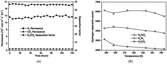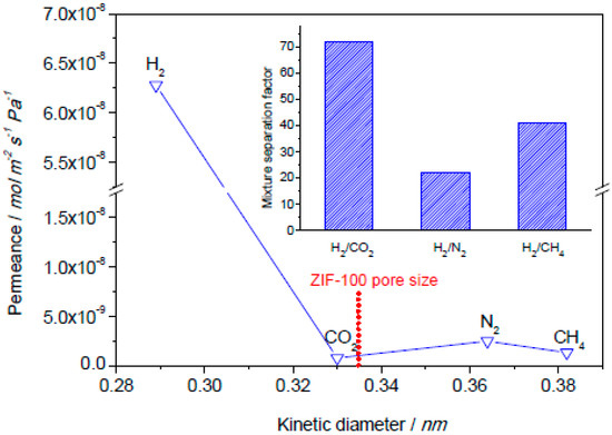 HKUST-1 MOF (also known as Cu3(btc)2 or MOF-199) was fabricated as a membrane and it was grown using the ‘twin copper source’ solvothermal method [113]. HKUST-1 MOF has a structure with small cages having diameters of ca. 13 and 10 Å, accessible through windows of ca. 11 and 9.3 Å, respectively. The single-gas permeation of HKUST-1 membrane exhibited a high permeation flux, which is expected due to the wider pore-aperture size of HKUST-1 than the kinetic diameter of common studied gas. The permeation results also showed a permeation selectivity in favor of H2 with respect to other gases, such as H2/N2 = 7, H2/CO2 = 6.8, and H2/CH4 = 5.9.