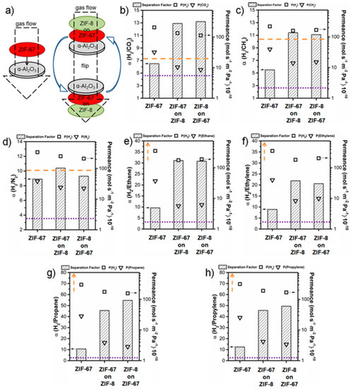 - Knebel, A.; Wulfert-Holzmann, P.; Friebe, S.; Pavel, J.; Strauß, I.; Mundstock, A.; Steinbach, F.; Caro, J. Hierarchical nanostructures of metal-organic frameworks applied in gas separating ZIF-8-on-ZIF-67 membranes. Chem. Eur. J. 2018, 24, 5728–5733. [Google Scholar] [CrossRef] [PubMed]