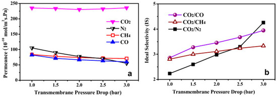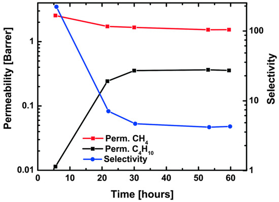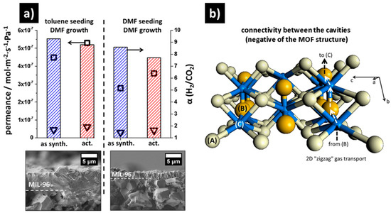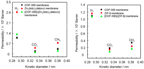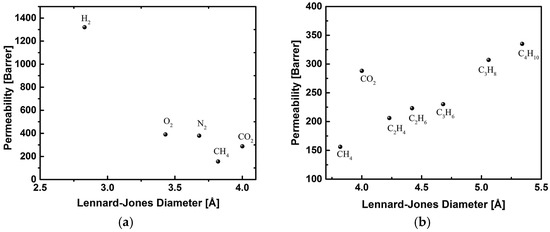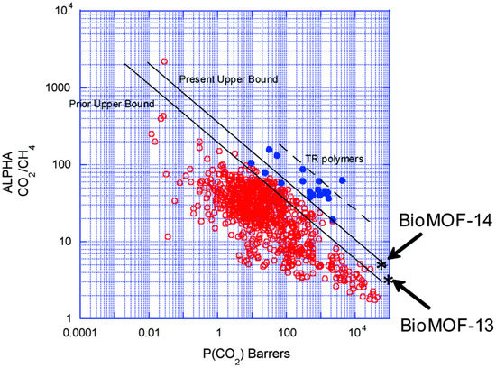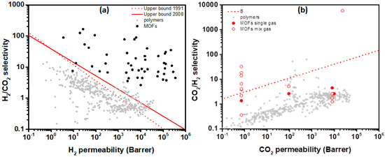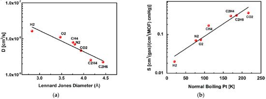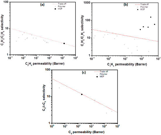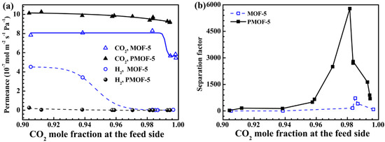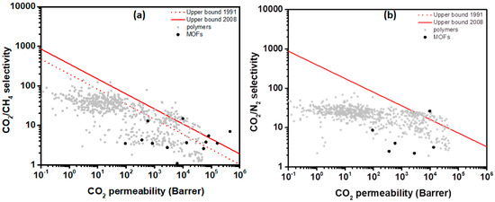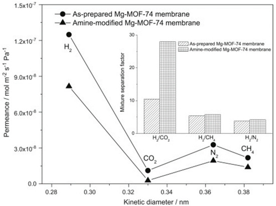 In principle, molecules in the gas mixture that have relatively stronger affinity/interactions with the pore system of the membrane will adsorb strongly and diffuse faster through the membrane if the pore’s apertures and size are larger than the dimensions of the permeates [31,32]. This case can lead to good separation (i.e., solubility-based separations) if the interactions are mild enough to allow for optimal desorption downstream, resulting in a permselectivity in favor of the highly absorbable analyte. Accordingly, the solubility-based separation can be enhanced by tuning the pore system surface through ligand modification or chemical functionalization [28,33,34,35,36]. This modification can lead in turn to variations in the pore aperture’s size and shape, the pore volume, and the surface nature or functionality—i.e., polarity, hydrophilicity, or hydrophobicity—which can lead to either an improvement or a drop in the selectivity-permeability trade-off [28].