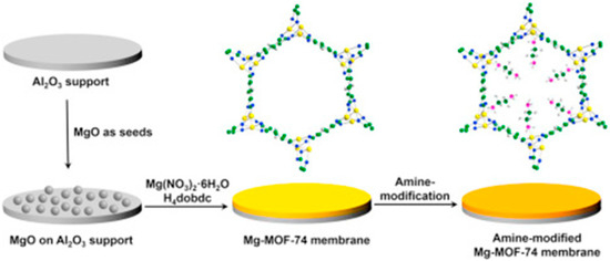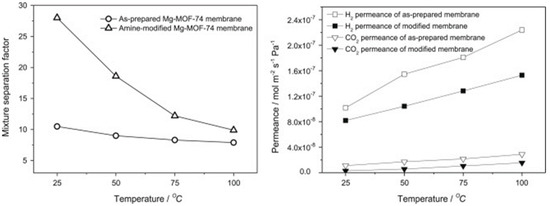 - Wang, N.; Mundstock, A.; Liu, Y.; Huang, A.; Caro, J. Amine-modified Mg-MOF-74/CPO-27-Mg membrane with enhanced H2/CO2 separation. Chem. Eng. Sci. 2015, 124, 27–36. [Google Scholar] [CrossRef]