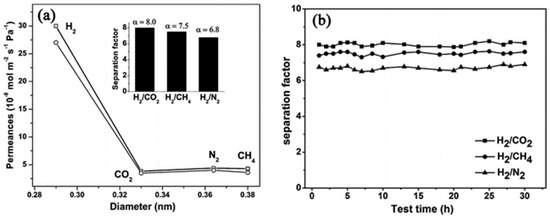 The unique properties of ZIFs, in terms of permanent porosity, pore-aperture sizes uniformity, and good chemical and high thermal stability made them a good candidate for their application as molecular sieve membranes [115,116,117,118]. ZIF-8, is one of the most studied ZIF, has a sodalite underlying topology with a~3.4 Å aperture size for the six-membered-ring as the sole entrance to the associated pores, which would be theoretically, able to separate H2 from the other larger components [38,67,115,119]. Caro et al. fabricated the first ZIF-8 membrane via applying the in situ solvothermal method [120]. The membrane single-gas permeation results of this ZIF-8 membrane showed a higher H2/CH4 selectivity of 11.2, relative to earlier reported MOF membranes. Besides, Jeong et al. successfully fabricated a 1 μm thick ZIF-8 membrane exhibiting enhanced a higher ideal selectivities for H2/N2 and H2/CH4 of 11.6 and 13, respectively [71]. Later on, Caro et al. established a bicontinuous ZIF-8@GO membrane by applying the LBL method using a graphene oxide (GO) suspension on a ZIF-8 membrane to close the gaps between the ZIF-8 crystals in the thin film [86]. These ZIF-8@GO membranes exhibited a higher selectivity in favor of H2, at 250 °C and 1 bar, which were 14.9, 90.5, 139.1, and 3816.6 for H2/CO2, H2/N2, H2/CH4, and H2/C3H8, respectively, with a high H2 permeance of about 1.3 × 10−7 mol·m−2·s−1·Pa−1. Other groups fabricated other ZIF-8 membrane using the seeding method, LBL method and counter diffusion method, and the permeation results are in good agreement with the H2 selectivities reported earlier.