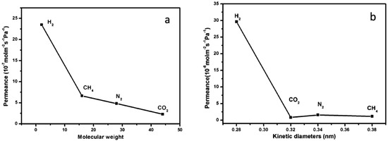 The first MOF-based membrane was reported in 2009 by Liu et al. It consisted of a MOF-5 membrane fabricated using an in situ solvothermal method on top of an alumina support [56]. The single gas permeation properties were investigated, and the results demonstrated that they follow Knudsen diffusion behavior, where the gases with lighter molecular weight permeates faster than other gases, suggesting that the pore-aperture size of MOF-5 is larger than all of the tested molecules in this case. H2, which has the lightest molecular weight permeates faster than the heavier studied gases, like CH4, N2, CO2, and SF6. Later on, the orientation of the MOF-5 membrane was controlled by using a seeding approach and the subsequent solvothermal secondary growth on various porous substrates was achieved [62]. The associated single gas permeation results of the preferentially oriented MOF-5 membrane was found to have the same behavior that is consistent with the prior report.
