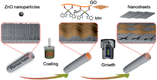 The preparation of a continuous pure ZIF-67 tubular membrane was achieved by Zhang et al. by direct transformation of carbonate hydroxide nanowire arrays (Co-NWAs) in a 2-methylimidazole (Hmim) aqueous solution, (Figure 5) [81]. This strategy included the growth of Co-NWAs on a porous ceramic tube as a first step, and then their conversion to a continuous ZIF-67 membrane by reaction in the Hmim aqueous solution, as shown in Figure 5.