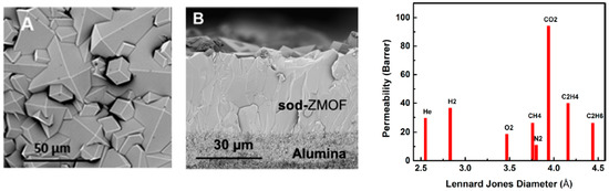 In the case of molecular sieving, i.e., size-selective separations, the kinetic diameters of the targeted analytes/molecules for separation dictate the selection of the MOF candidates with the suitable pore aperture for a given separation [37]. Here, it is to be noted that various studies reported that even gases that have a kinetic diameter larger than that of the pore aperture are still able to permeate through the MOF membrane, which is plausibly governed by the well-known framework flexibility in MOFs [38,39,40,41,42]. The widespread flexible nature of the MOFs make the selection of the MOF for membrane-based separation extremely challenging. In addition, MOF-based thin films development experience other serious challenges that should be considered in order to apply the MOFs as membranes, such as the facility of fabrication, the crystallinity of the films, the directionality of the growth, the activation condition, the controlled tunability, and the functionality and flexibility of the structure.