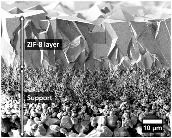 In 2010, Jeong et al. fabricated both ZIF-8 and ZIF-7 membranes via the direct functionalization of the support with the organic ligand [69]. The principle is simply based on the reaction of the imidazole linkers with the preheated support to generate an Al–N bond. Accordingly, the Al2O3 supports were heated at first to ~200 °C, and were then directly exposed to the solution of the ligand, which led to the fast evaporation of the solvent in the organic solution. This leaves the organic linkers that were covalently bonded to the Al2O3 support. Later, growth on the modified supports was performed while using the in situ solvothermal growth approach.