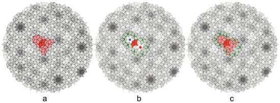 Figure 2. For this first simulation, we have chosen the vertex type isomorphic to the decagon that does not have five-fold symmetry because it allows a larger variety of movement patterns and it has an interesting configuration, being bordered by a star configuration on one side and a sun on the other. The analysis of other vertex types, however, is the subject of our ongoing work. In this study, we select a K vertex/vertex patch as the ‘living’ or dominant vertex/patch. All tiles in the local empire live also inside the empire window, and therefore any local patch that includes K and is included in the local empire would have the same empire field. Hence, the local empire of the chosen K type vertex patch can be treated as part of its quasiparticle, its ‘supporting’ tiles. The rest of the empire, the non-local part, will be considered as the field of the quasiparticle and will be used to calculate its interaction with the environment. The gray tiles shown in