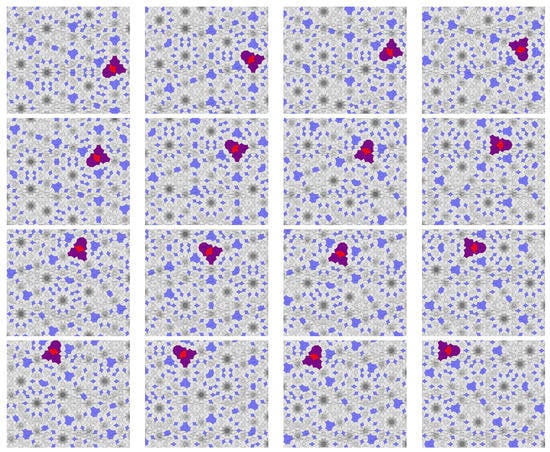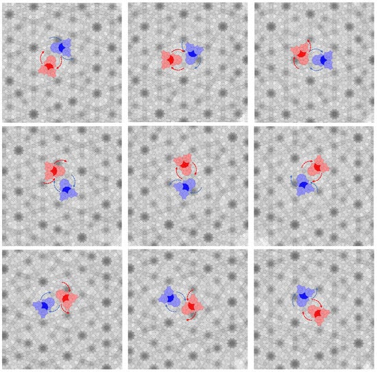 https://youtu.be/HjvJEs_kUxU. Choosing the neighbors 3–4 gives the same rotation, but counterclockwise. Choosing the 3–8 neighbors, the quasiparticle rotates around a circular configuration of tiles, tangent to one of the particle’s tiles. The minimum area covered by rotation is achieved when only the neighbor 8 is chosen, while the maximum area covered by rotation is achieved for 3–6.