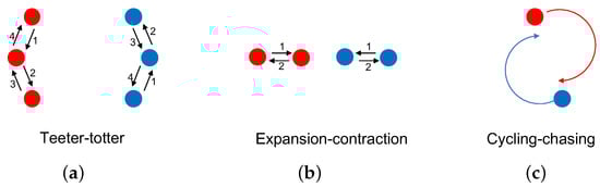 is the union of the empires of all dominant vertices. As a separate rule, we also restrict the movement of the quasiparticles by not allowing their local empires to overlap. For the case of two vertex patches, depending on the initial conditions, meaning the position and orientation of the particles with respect to each other, the two quasiparticles will eventually evolve into a stable oscillation or rotation pattern, as shown in