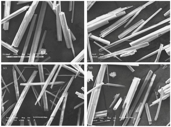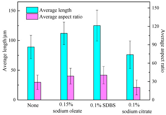Figure 1 shows the images of the hydrothermal products with and without additives. Compared with the products without additives, the length increased while the diameter decreased after sodium oleate and SDBS were added separately. When it comes to the products with sodium citrate, short columns with a large diameter were obtained. Combining the length and the aspect ratio shown in Figure 2, the calcium sulfate whiskers with an average length of 89 μm and an aspect ratio of 29.67 were obtained in the absence of additives. Both the length and the aspect ratio increased after sodium oleate or SDBS was added. Specifically, calcium sulfate whiskers with a length of 125 μm and an aspect ratio of 41.67 were obtained when 0.1% SDBS was added. They were the longest and thinnest among the four products. When 0.15% sodium oleate was added, whiskers with a length of 112 μm and an aspect ratio of 40 were obtained. However, when 0.1% sodium citrate was added, the thickness of the whiskers increased and the average aspect ratio decreased to 21.05.