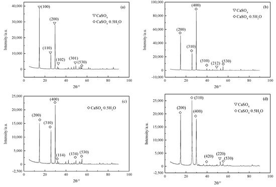 It was verified that the additives could adsorb on specific crystal faces selectively, which prevented the adsorption of Ca2+ and SO42−. Moreover, the additive molecules limited the movement of the ions. The products presented different morphologies due to the selective adsorption of the additives [44,45].