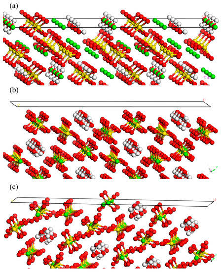 Structures of the crystal faces of (a) (400), (b) (310), and (c) (530). (Note: Red balls represent O. White balls represent H. Yellow balls represent S. Green balls represent Ca).