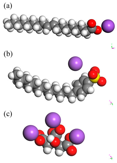 Structure of (a) sodium oleate, (b) SDBS, and (c) sodium citrate. (Note: Red balls represent O. White balls represent H. Yellow balls represent S. Green balls represent Ca. Purple balls represent Na).