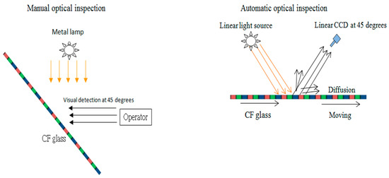 Currently, manual optical inspection (MOI) is widely used to observe the non-uniformity of colour filters by human eyes that identify diversified non-uniformity through various light sources, including fluorescent lights, halide lamps, sodium lamps, and light-emitted diodes (LED) as illustrated in Figure 1 (left), where CF denotes colour filter. The main drawback of MOI is its dependence on the human subjective judgement even though human eyes are very sensitive to colour changes. In contrast, the machine vision of AOI, shown in Figure 1 (right), is quantitative without humans’ drawback.