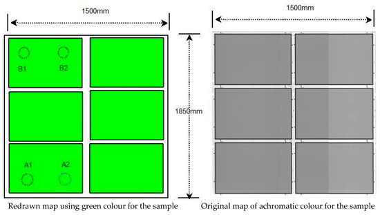 Typically, four kinds of spot non-uniformity defects on the green layer were to be evaluated. They are labelled as A1, A2, B1, and B2 in Figure 3. Both A1 and A2 were the samples with artificial defects at 20 mm in diameter, which were dark regions and thick films of low transparency. In contrast, both B1 and B2 (also manmade defects of the same diameters of 20 mm) were bright regions and thin films with high transparency. After obtaining the image data, the embedded software identified the grey level variations to judge whether the threshold was reached to reveal the defect.