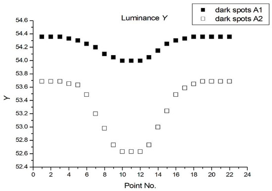 Variation of CIE y for dark spots of A1 and A2.