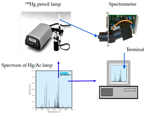 Figure 14 presents the architecture of the calibrated spectrometer linking 198Hg discharged lamp which utilizes spectral lines to calibrate the spectrometer in the visual spectrum [20,21,22]. This calibrated apparatus adopts the Model 6034 pencil lamp from Oriel Instruments. The criterion for the shift of the wavelength is small than 1 pixel for the spectrometer; 1 pixel calculation based on the spectrometer capacity is the difference between the maximum value and the minimum value divided by the spectrometer resolution. In this task, 1 pixel is at (1050 − 380)/256 = 2.6 nm. The measurement standard deviation is at 0.8 nm for the spectrometer.