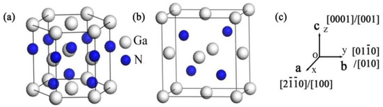 Structures of GaN crystals: (a) wurtzite GaN; (b) zinc-blende GaN; and (c) crystallographic axes and directions.