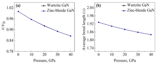 The ratio of V to V0 is applied to evaluate the relative change in unit cell volume under different pressures, where V and V0 are volumes of the unit cell at a specified pressure and zero pressure, respectively. Pressure dependences of V/V0 of the two GaN crystals are shown in Figure 2a. Obviously, V/V0 value decreased substantially with the increasing hydrostatic pressure, and the pressure presented an extremely similar trend effect on V of the two GaN crystals. This is due to the fact that the average bond lengths of the two GaN crystals are also very close to each other under the same pressure, see Figure 2b.