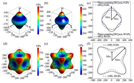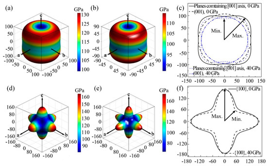 Direction dependences of the elastic moduli of GaN single crystals: (a) wurtzite GaN, 0 GPa; (b) wurtzite GaN, 40 GPa; (c) projections on main crystal planes, wurtzite GaN; (d) zinc-blende GaN, 0 GPa; (e) zinc-blende GaN, 40 GPa; (f) projections on main crystal planes, zinc-blende GaN.