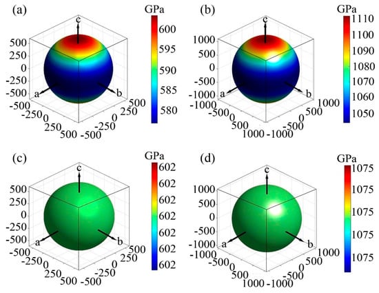 Direction dependences of the bulk moduli of: (a) wurtzite GaN, 0 GPa; (b) wurtzite GaN, 40 GPa; (c) zinc-blende GaN, 0 GPa; (d) zinc-blende GaN, 40 GPa.