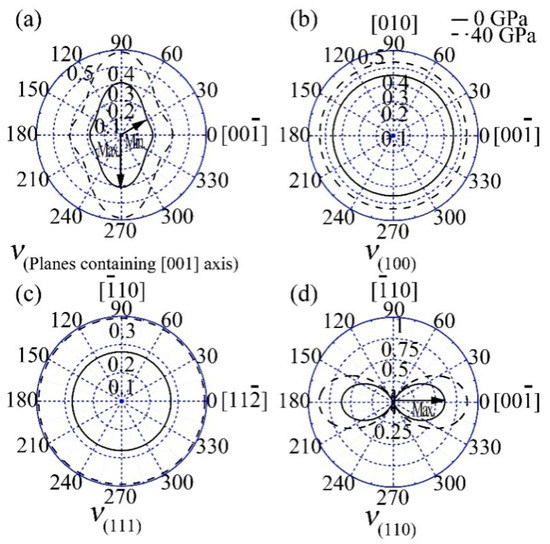 Figure 7a illustrates the Poisson’s ratios of wurtzite GaN at the planes containing the [001] axis, in which the maximum Poisson’s ratio is 0.31 at zero pressure and the value is in the orientations vertical to [001] axis. Correspondingly, the minimum value of Poisson’s ratio is 0.19, and the angle between its orientation and direction [001] is 25.8°. When the pressure increased to 40 GPa, the maximum and minimum values were 0.488 and 0.271, respectively, and their locations were the same with those at zero pressure. In addition, the Poisson’s ratio along the [001] direction of wurtzite GaN were 0.185 and 0.304 at pressures 0 and 40 GPa, respectively. Moreover, Poisson’s ratios of zinc-blende GaN at crystal planes (100) and (111) are isotropic, see Figure 7b,c; they were 0.355 and 0.174, respectively, at zero pressure and 0.432 and 0.293, respectively, at apressure of 40 GPa. However, for zinc-blende GaN, the Poisson’s ratio at crystal plane (110) showed obvious anisotropy, see Figure 7d, where the maximum values, 0.608 (0 GPa) and 0.872 (40 GPa), were located at the [001] and [] directions. In addition, the minimum values were 0.104 (0 GPa) and 0.145 (40 GPa) (actually, −0.104 and −0.145); these are in the orientations [] or [] at zero pressure.