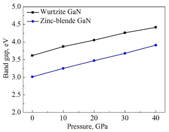 Band gap is a basic and critical physical parameter that determines the electronic properties of semiconductor materials. It has been reported that the band gap of wurtzite GaN is 3.5 eV [58] and 3.1 eV for zinc-blende GaN [66]. The influence of pressure on the electronic properties of the two GaN crystals was evaluated. In this study, a HSE06 scheme [67] was used for the calculation of the band gap. Results show that, at zero pressure, the calculated band gaps of wurtzite and zinc-blende GaN crystals were 3.62 and 3.01 eV, respectively, which are similar to previous experimental values. Figure 8 displays the calculated band gaps of the two GaN crystals at different hydrostatic pressures. Clearly, both crystal structure and pressure have obvious influence on the band gap, and the band gap of wurtzite GaN is much larger at the same pressure. Generally, the band gaps of the two GaN compounds increased linearly with the increase of hydrostatic pressures; the lines in Figure 8 can be analysed by the following equation [68]: