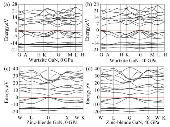 Band structures: (a) wurtzite GaN, 0 GPa; (b) wurtzite GaN, 40 GPa; (c) zinc-blende GaN, 0 GPa; (d) zinc-blende GaN, 40 GPa.