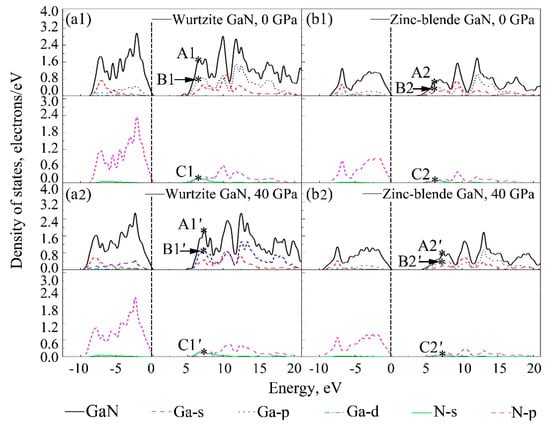Pressures versus density of states (DOSs) for: (a1) wurtzite GaN, 0 GPa; (a2) wurtzite GaN, 40 GPa; (b1) zinc-blende GaN, 0 GPa, (b2) zinc-blende GaN, 40 GPa.