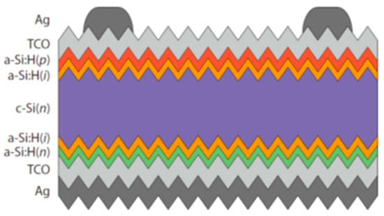 From the cell fabrication process perspective, a-Si:H/c-Si heterojunctions have the following advantages over a conventional diffused-homojunction: (1) Excellent passivation properties, which achieve a high Voc and therefore a high efficiency; (2) low processing temperatures, which prevent bulk quality degradation in low-quality c-Si wafers; (3) a better temperature coefficient, compared to diffused-homojunction cells; and (4) a low-cost fabrication process, with a high potential for reducing production costs [26,27,28]. By the continuous optimization of the intrinsic a-Si:H passivation layer, back surface field and back-side passivation, highly conductive transparent ITO, texturing surface, metal grid lines, and wafer quality, Panasonic has increased its best cell efficiency to 24.7% on large areas [28]. The best Voc reached 750 mV, which was much higher than that of the state-of-the-art homojunction counterpart. Another prestigious Japanese corporation, Kaneka, reported an even higher efficiency of 25.1%, with a Voc of 738 mV, Jsc of 40.8 mA/cm2 and FF of 83.5% [19]. The schematic cross-section of a typical SHJ solar cell is shown in Figure 1.