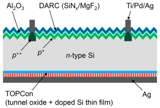 Schematic cross-section of a typical tunnel oxide passivated contact (TOPCon) solar cell [23].