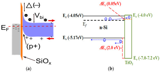 Metal oxides with a low work function and small conduction band offset with n-Si are promising candidates for insertion between the Si/Al interface in order to alleviate the Fermi level pinning effect and reduce the energy barrier for electrons. For example, the TiOx/Si interface has been demonstrated to have a small conduction band offset (ΔEc~0.05 eV) and a high valence band (ΔEv~2.0 eV), which would allow the transport of electrons from silicon to TiOx and a large valence band offset, and block the holes from silicon to TiOx, as illuminated in Figure 4b [43].
