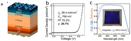 Current experimentally-reported DASH solar cells based on TMO usually adopt a both-sides contacted front-junction structure [30,31,35,36,37,38,40,41,42,43,44,45,46,47]. The c-Si solar cell, with only MoOx as the hole-selective contact, which has a structure of ITO/MoOx/i-a-Si:H/c-Si/i-a-Si:H/n-a-Si:H/Al, demonstrated a record conversion efficiency of 22.5%, compared with the current TMO-based solar cells [37]. If both hole- and electron-selective contacts were made of dopant-free TMO materials, the current highest conversion efficiency is 20.7%, with a structure of TCO/MoOx/i-a-Si:H/c-Si/i-a-Si:H/TiOx/LiF/Al, of which the structure, J–V curve, external quantum efficiency, internal quantum efficiency, and reflection are shown in Figure 5 [40].