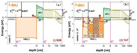 Schematic diagram of the band structures of the heterojunction between c-Si and transition metal oxides (TMO), with different electron affinities [88]. (a) The electron affinity of TMO is 6.0 eV, and band-to-band tunneling is dominating the hole transportation (B2B); and (b) the electron affinity of TMO is 5.3 eV, and defect-assisted tunneling is dominating the hole transportation (TAT).