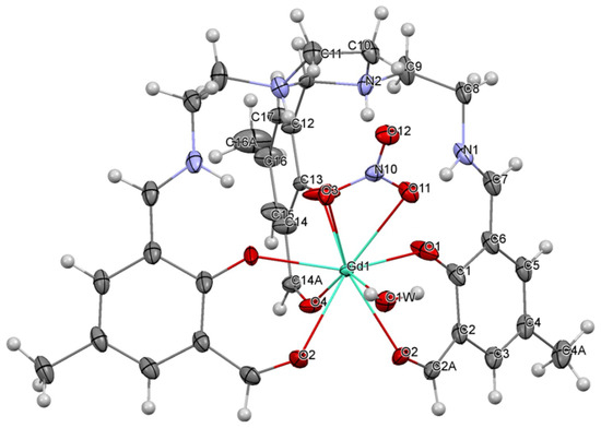 Mononuclear Gd (Figure 1) was readily obtained by template synthesis, as other analogous TbIII, DyIII, or ErIII mononuclear complexes containing this ligand [16], by simple mixing of triethylenetetramine, 2-hydroxy-5-methyl-1,3-benzenedicarboxaldehyde, and gadolinium nitrate in 1:3:1 molar ratios. After cooling only 24 h in the fridge, single crystals of Gd could be isolated. In contrast, multiple attempts to isolate a similar mononuclear gadolinium(III) complex derived from H3L were made without success. This was not surprising, as this type of three-armed ligand derived from triethylenetetramine and aromatic aldehydes is prone to yielding dinuclear lanthanoid complexes of the [Ln(L)]2 type, with a sandwich structure [42,43,44,45,46,47].