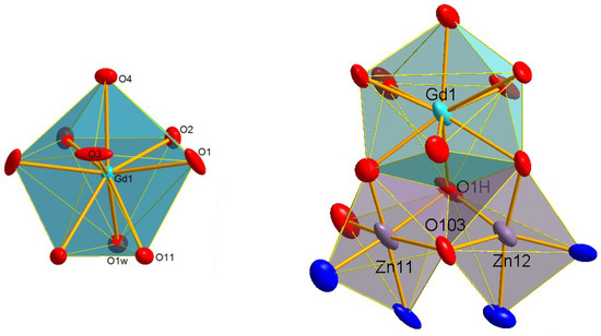 The deviation of the coordination sphere with respect to an ideal nine-vertex polyhedron was calculated with the SHAPE software [49], and results indicate a muffin-like appearance, also near to a spherical capped square antiprism (Figure S2 and Table S4 in the Supplementary Materials. This muffin-like polyhedron that surrounds the gadolinium(III) ion shares one edge with each zinc pseudo-polyhedron, whilst these polyhedra around both zinc centers also share one edge (Figure 3), as occurs for [Zn2Ho(L)(ald)(HO)(H2O)3(MeCN)](NO3)2·EtOH [17].
