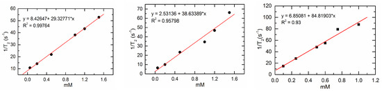 Plots of 1/T2 vs. concentration of the following species: (left) Gd′; (middle) ZnGd; and (right) Zn2Gd′.