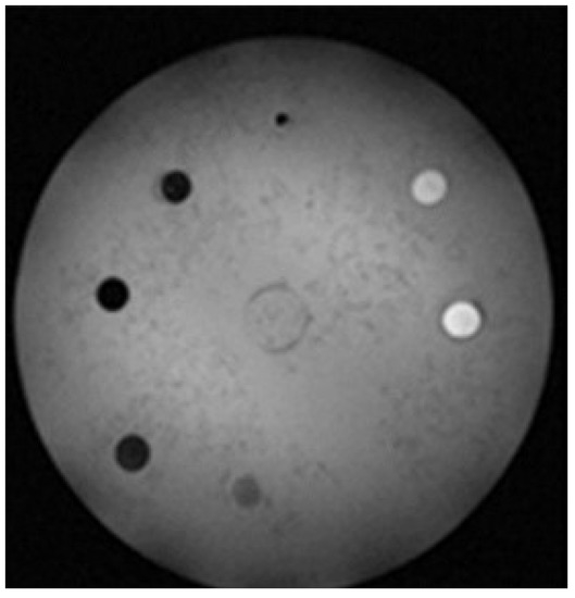 T2-weighted MR image for six different increasing concentrations (clockwise) of ZnGd (0.05, 0.2, 0.5, 1, 1.2, and 1.5 mM), with the reference at the top center.