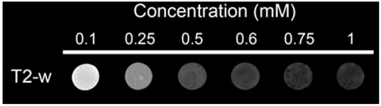 For ZnGd, the r1 value of 4.90 mM−1 s−1 (Table 1) extracted from methanol solutions is comparable with those found for other commercial agents [56], so it may be considered as a potential T1 contrast agent. Nevertheless, the r2 value is 38.63 mM−1 s−1 (Figure 5) and, therefore, the T1/T2 (r2/r1) ratio is 7.9, a value that strongly differs from 1. As a consequence, this precludes the use of ZnGd as a positive MRI contrast [27]. However, the quite high r2 value found for this heteronuclear Zn-Gd complex, in connection to the T1/T2 ratio higher than 6 (a condition for being used as a T2 contrast agent), appears to indicate that it is more suitable as a negative MRI contrast, while the most usual T2 agents were based on magnetic iron oxide nanoparticles [29]. This behavior as negative contrast appears to be confirmed by in vitro MRI experiments with agarose gel phantoms. Thus, as Figure 6 shows, the T2-weighted phantoms show that darker images can be obtained by increasing the complex concentration.
