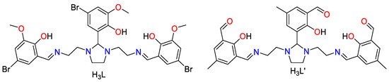 - Xie, Q.F.; Huang, M.L.; Chen, Y.M. Bis{μ-1,3-bis[2-(5-bromo-2-oxidobenzylideneamino)ethyl]-2-(5-bromo-2-oxidophenyl)-1,3-imidazolidine}dineodymium(III) N,N-dimethylformamide hexasolvate. Acta Cryst. 2009, E65, m1660. [Google Scholar] [CrossRef] [PubMed]