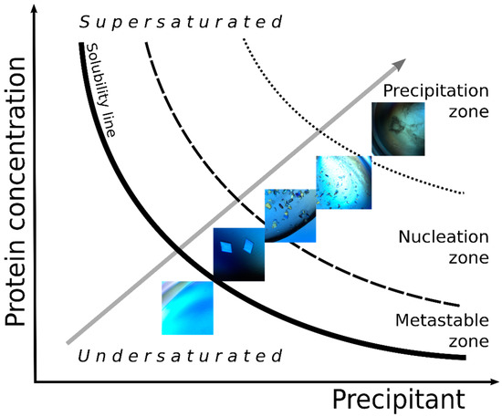 A schematic representation of a phase diagram showing the solubility of a protein in solution as a function of the concentration of the precipitant. The grey arrow illustrates the estimated path of crystallization. The path leads from the undersaturated zone below the solubility curve, where no crystals can grow, to the precipitation zone, where supersaturation is too high and protein precipitates without forming crystals. Below the precipitation zone is the nucleation zone, where the supersaturation is high and nucleation is observed, but the crystal growth is slow. In the metastable zone, the nucleation does not occur spontaneously, but the supersaturation is low and suitable for crystal growth [14].