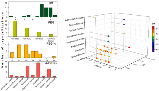Distribution of the number of successful protein crystallizations of all PEG conditions found in systematic screening as a function of pH, size of the PEG, PEG %, and which additives were included. A 3D graph that displays all of the components of the PEG conditions is shown on the right.