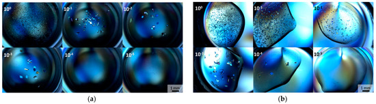 The effect of diluting and testing the seed stock solution. Crystallization drops were set up in 0.1 M Tris pH 8.5, 30% PEG 4000, 0.2 M sodium acetate in a ratio of 3:2:1 (protein:precipitant:seeds) in (a) vapor diffusion sitting drop set-up (total drop volume is 24 µL) and (b) microbatch with paraffin oil set-up (total drop volume is 15 µL).